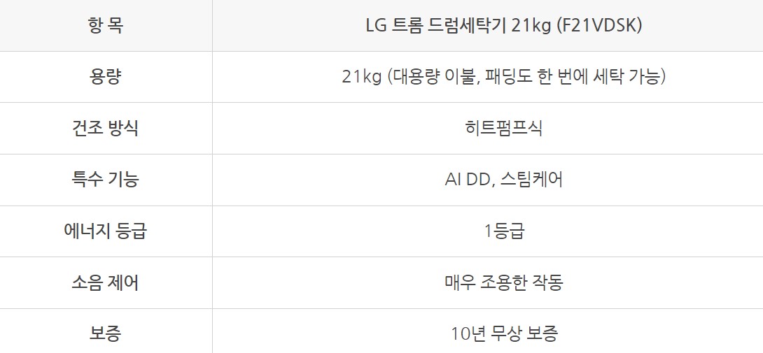 LG 트롬 드럼세탁기 F21VDSK, 정말 강력 추천합니다! 바쁜 일상 속에서 빨래하는 시간을 줄여주고, 옷감 손상 걱정 없이 깨끗하게 세탁할 수 있어 정말 만족스러워요.