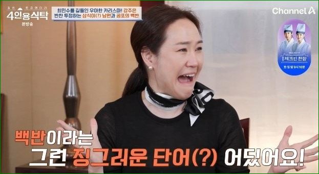 한국 주방의 화려한 반찬 문화에 대해 강주은은 "백반은 왜 백 가지나 필요하죠? 그냥 이름부터 공포스러워요!"라며 당시의 당혹감을 웃음 섞인 농담으로 전했어요.