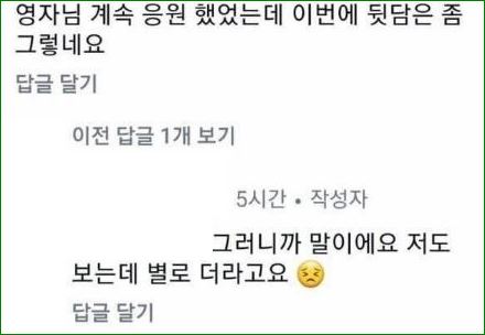팬들도 이 논란에 가세했는데요, 한쪽은 정숙의 눈물을 이해하고, 다른 쪽은 영자의 불편한 심정을 지지했어요. 여러분이라면 누구의 편에 서시겠어요?