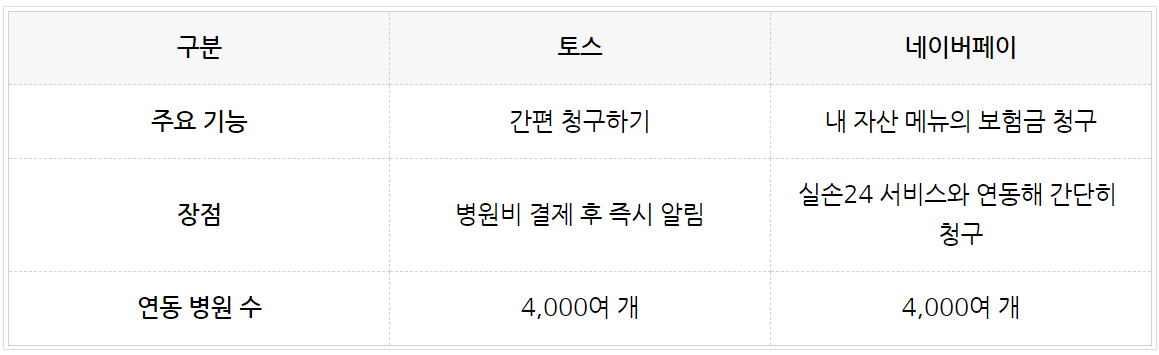 토스와 네이버페이 같은 생활 금융 앱에서도 이제 실손보험 청구를 할 수 있습니다. 예를 들어, 토스의 ‘간편 청구하기’ 기능을 통해 병원비 결제 후 알림을 받아 몇 번의 터치로 보험금을 받을 수 있고, 네이버페이도 ‘내 자산’ 메뉴에서 쉽고 빠르게 보험 청구가 가능하죠.