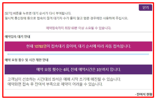 - 예약 요청 횟수는 최대 6회, 전체 예약 시간은 3분까지 제한됩니다.